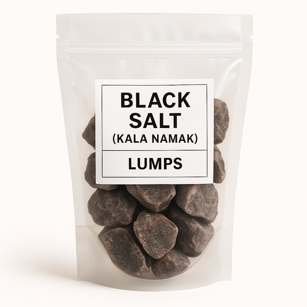 Black Salt Lumps, also known as Kala Namak, are naturally occurring mineral salt crystals formed from volcanic rock salt. These dark purple to black chunks turn pinkish-grey when ground and release a distinctive sulfur-rich aroma.